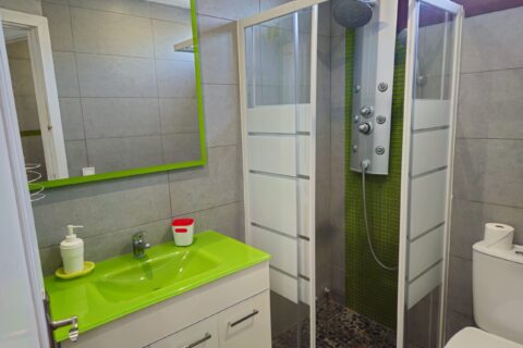 The apartment features a living-dining room, a fully equipped kitchen with a washing machine, two bedrooms, and a bathroom. It also has a separate toilet for added convenience. The bathroom includes a hydro-massage shower with 6 jets, perfect for relaxation.